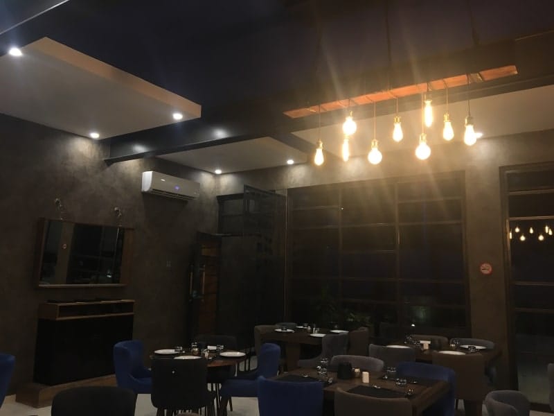 Bina çok çağdaş bir tasarıma, metal bir yapıya, cumbalı pencereye ve ahşaba sahiptir. Restoranın hakim renkleri siyah, gri ve beyazdır. Yarı rahat tarz orada. Nargile şeklindeki bir tabela, çok orijinal olan binaya bakmaktadır. Yapılarda ışıklar eksik değil. Bununla birlikte, zeminde, tavanda spot ışıklarla çok iyi aydınlatılmış ve avizelerin varlığına dikkat edeceğiz. Tasarım seviyesi, her şey nikeldir.